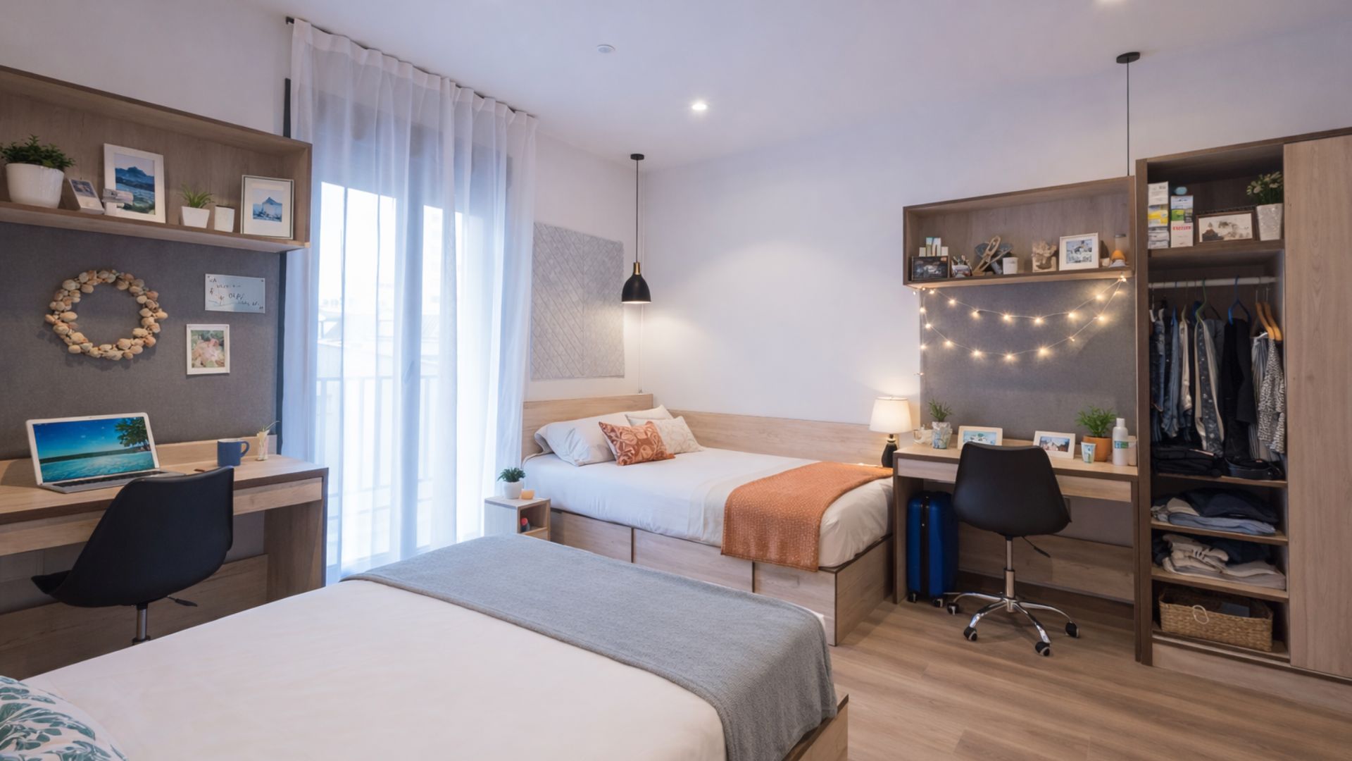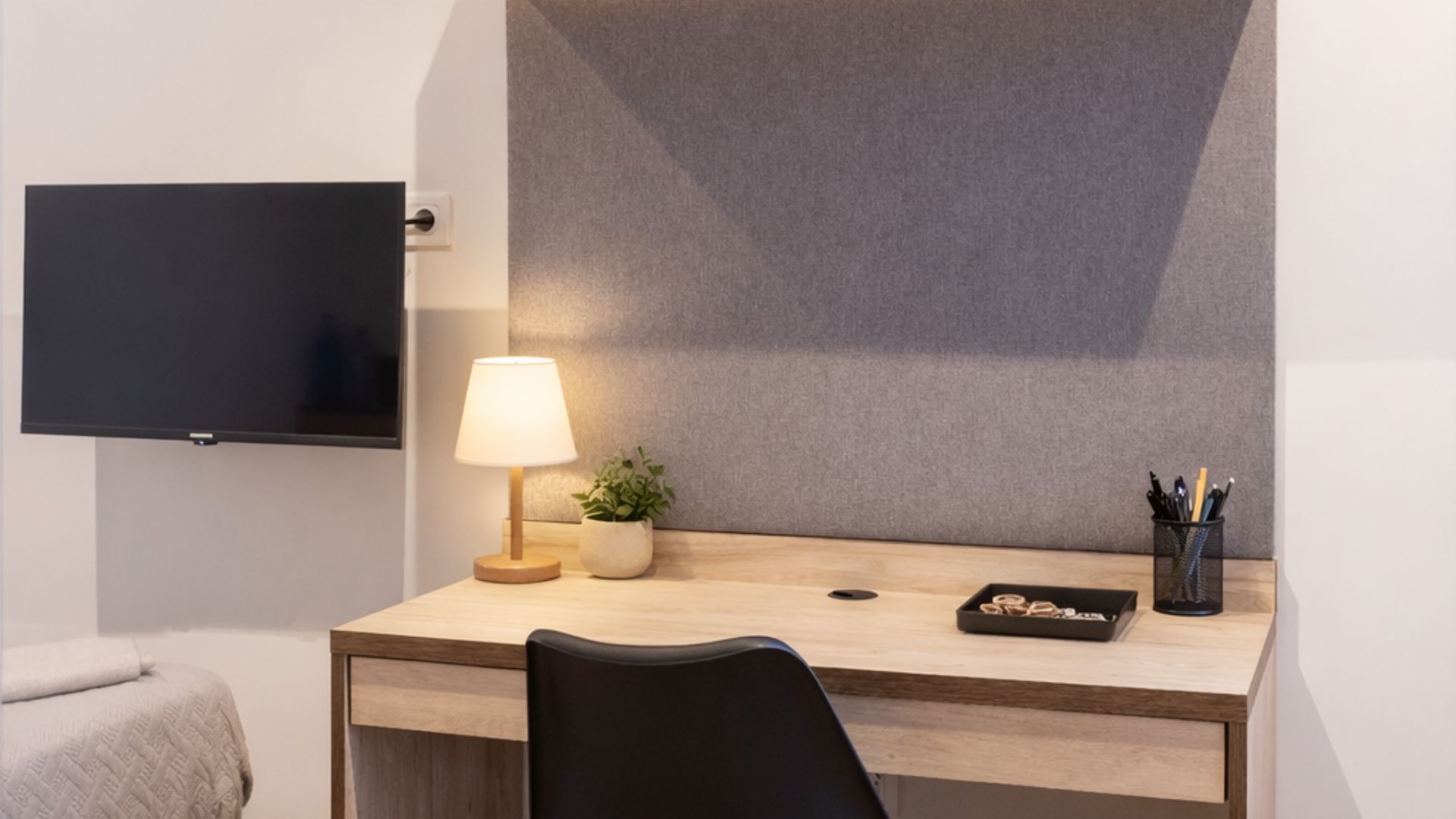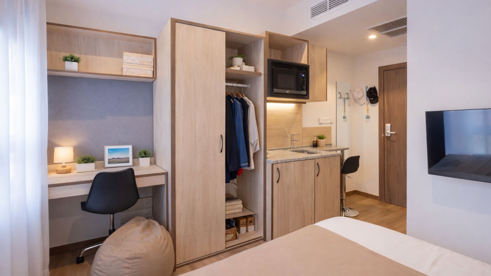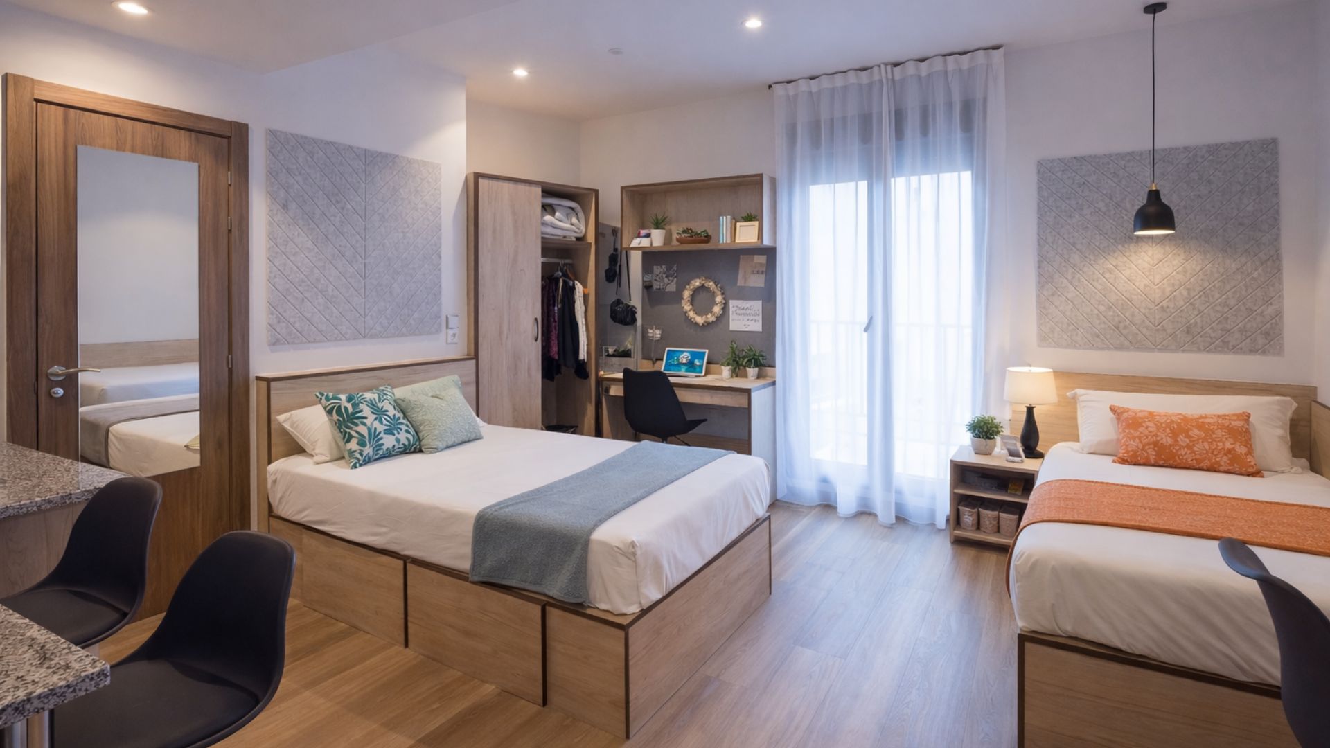Habitación moderna en residencia de estudiantes en Madrid Plaza España, alojamiento universitario con escritorio y zonas de estudio